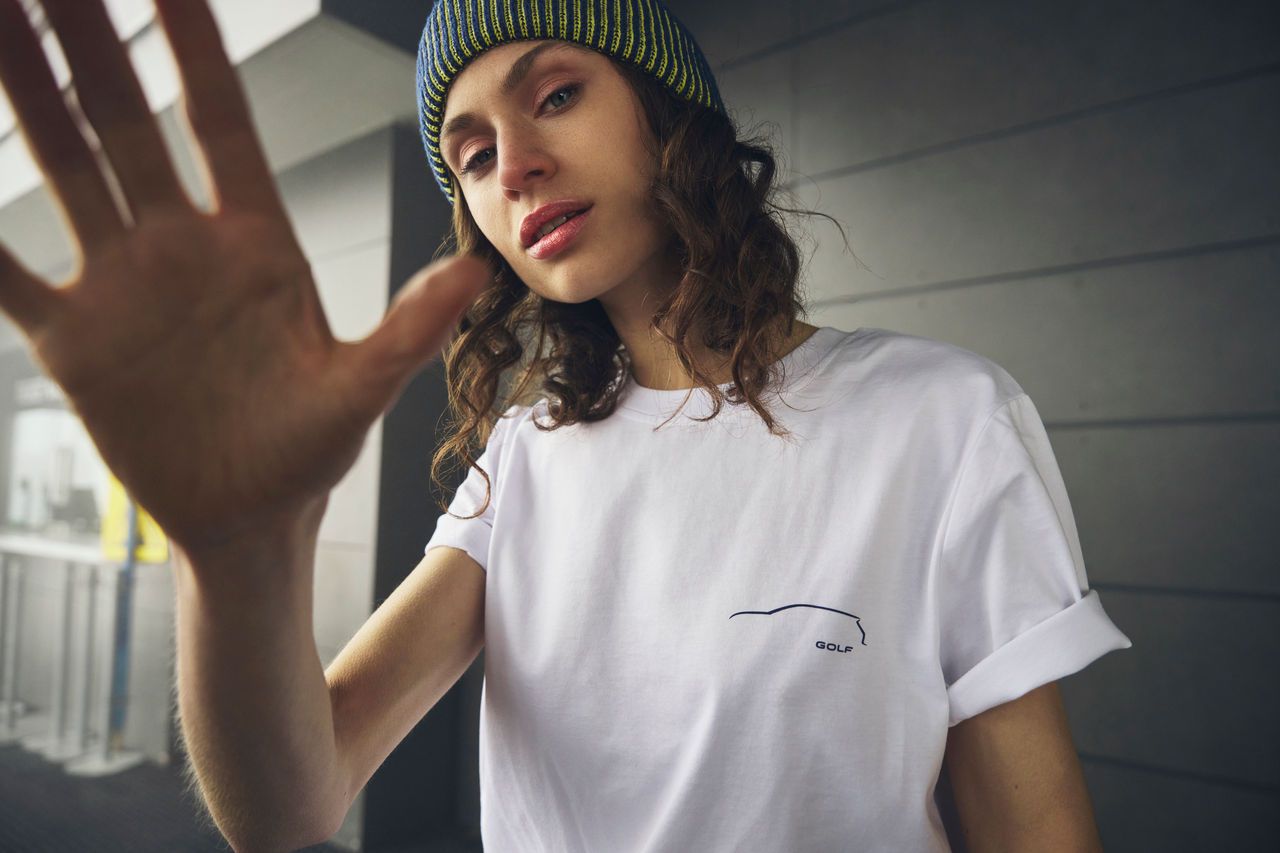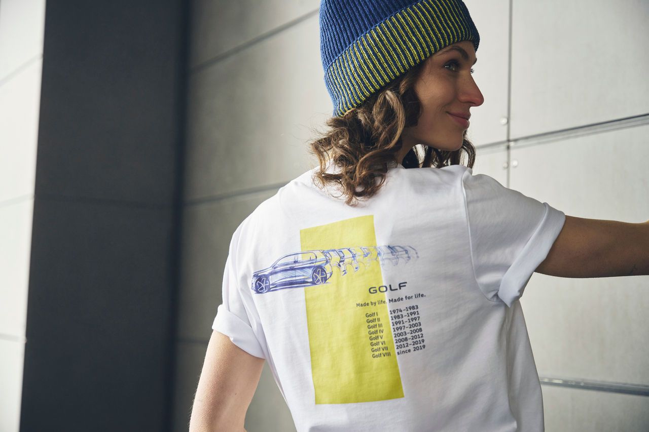 S týmto unisex tričkom môžete vyjadriť svoju vášeň pre Golf a zároveň nosiť kúsok histórie modelu vo svojom každodennom živote. Veľkoplošná potlač na chrbte zobrazuje vývoj vozidla v celkovo ôsmich generáciách ako štýlovú koláž náčrtov, ako aj obdobia výroby jednotlivých modelových radov. Moderný vzhľad dopĺňa reliéfna silueta modelu Golf na prednej strane v oblasti hrudníka. Tričko je k dispozícii vo veľkostiach S–2XL.