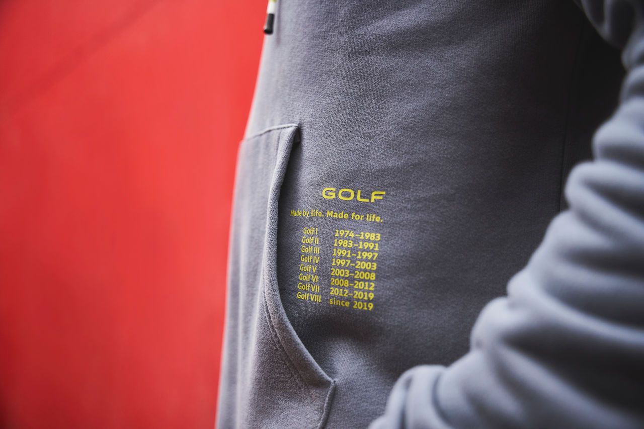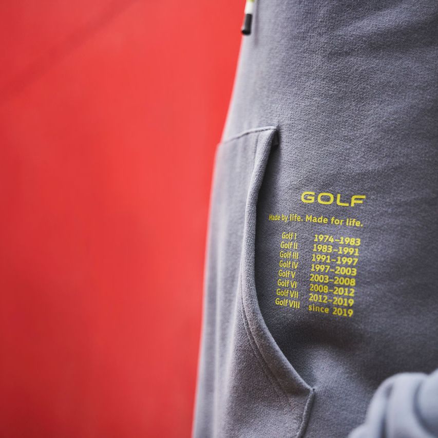 Tu sa stretáva príjemný komfort nosenia s ikonickým dizajnom. Už na vreckách je jasné posolstvo – „GOLF – Made by life. Made for life.“ a roky výroby jednotlivých sérií vynikajú vďaka kontrastnej žltej farbe na sivej mikine s kapucňou. Aj šnúrky s potlačou „GOLF“ a silueta vozidla na pravom ramene dodávajú nositeľovi autentický pocit. Mäkká mikina s kapucňou z francúzskeho froté a podšívkou je k dispozícii vo veľkostiach S–2XL.