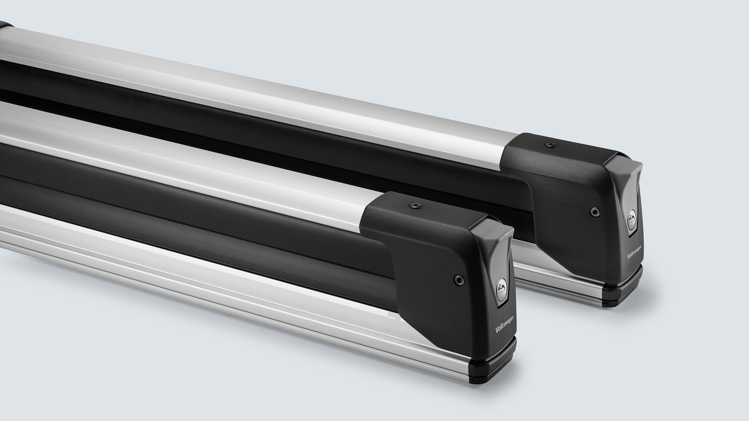 Strieborné strešné nosiče pasujú k strešným konštrukciám Volkswagen. Sú kompletne zmontované a môžu sa priamo pripevniť na strešný nosník. Nevhodné pre model T‑Roc Cabriolet.